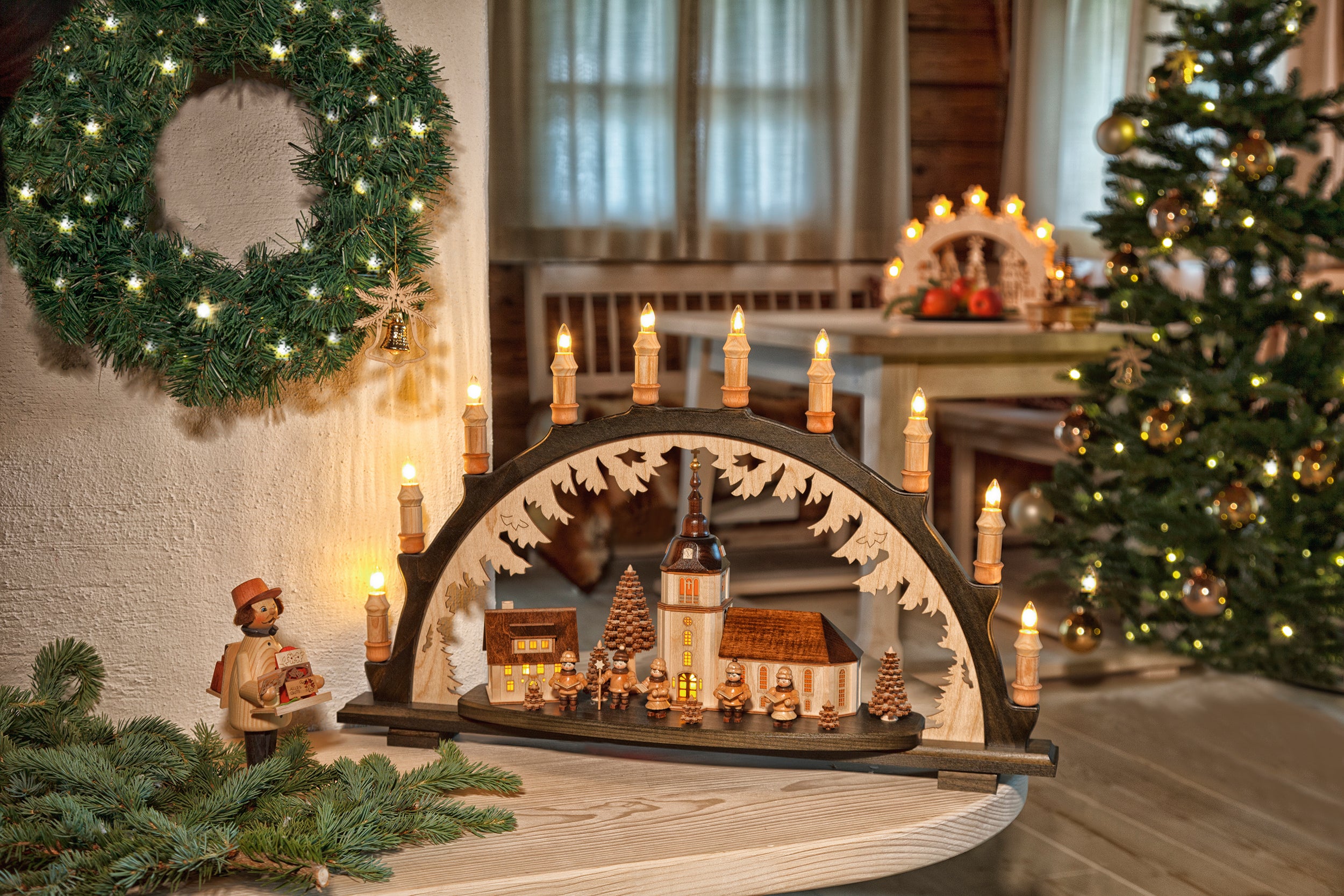 Diese exquisiten Dekorationen stammen aus dem Erzgebirge, einer Region in Deutschland, die für ihre lange Geschichte der Holzschnitzerei bekannt ist. Jede Figur und jedes Ornament wird mit größter Sorgfalt und Liebe zum Detail handgefertigt. Typische Motive sind Nussknacker, Räuchermännchen und filigrane Pyramiden, die durch ihre kunstvolle Gestaltung und hohe Qualität bestechen.
